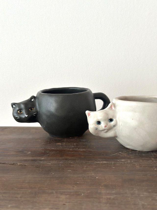 こっちを見ている猫のカップです。 小ぶりなので小物入れなどにもおすすめです。 size A黒猫 高さ6.3cm 口径6.2cm横幅(顔〜取手)12.8cm B白猫 高さ5.8cm口径5.8cm横幅(顔〜取手)13.5cm サイズはおおよそですのであらかじめご了承ください。 作品には製造時にできた凹み、歪み、貫入、釉薬の濃淡のあるものもございますが、ダメージではありませんので、ご了承くださいませ。