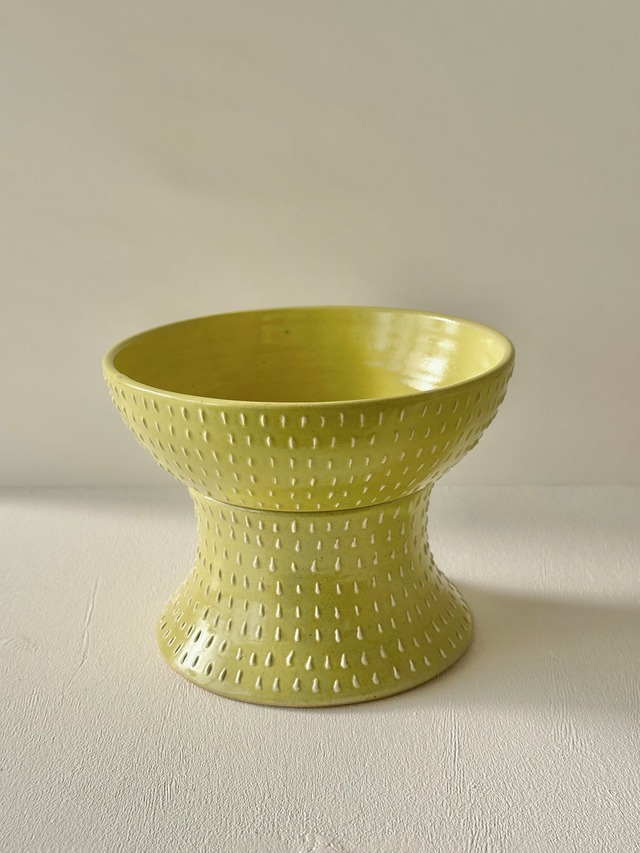 レモンイエロー ボウル口径 15.0cm ボウル高さ 4.5cm 台座+ボウル 高さ 10.8cm 高さのあるフードボウルは楽な姿勢で食事ができ、吐き戻しを防ぐ効果があります。 ボウル部分を取り外しできますので、お食事を運んだり、洗ったりしやすい仕様になっています。 遊び盛りの仔がご使用になる場合は、器にぶつかって破損しないよう、お食事以外はボウル部分をしまっておくなどのご注意をお願い致します。 サイズはおおよそですのであらかじめご了承ください。 作品には製造時にできた凹み、歪み、貫入、釉薬の濃淡のあるものもございますが、ダメージではありませんので、ご了承くださいませ。