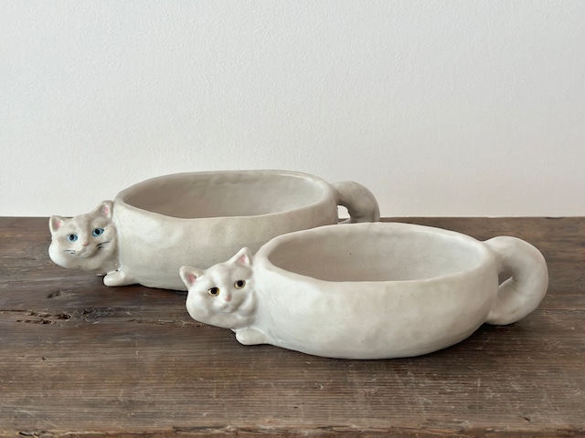 こっちを見ている猫のオーバル小鉢です。 食卓のお供にいかがですか。 size C短毛オッドアイ 高さ4.7cm 口径12.5cm×9cm 器全体の横幅19.5cm 奥行9.4cm D短毛黄目 高さ5.2cm 口径12.5cm×9cm 器全体の横幅19.0cm 奥行9.7cm サイズはおおよそですのであらかじめご了承ください。 作品には製造時にできた凹み、歪み、貫入、釉薬の濃淡のあるものもございますが、ダメージではありませんので、ご了承くださいませ。