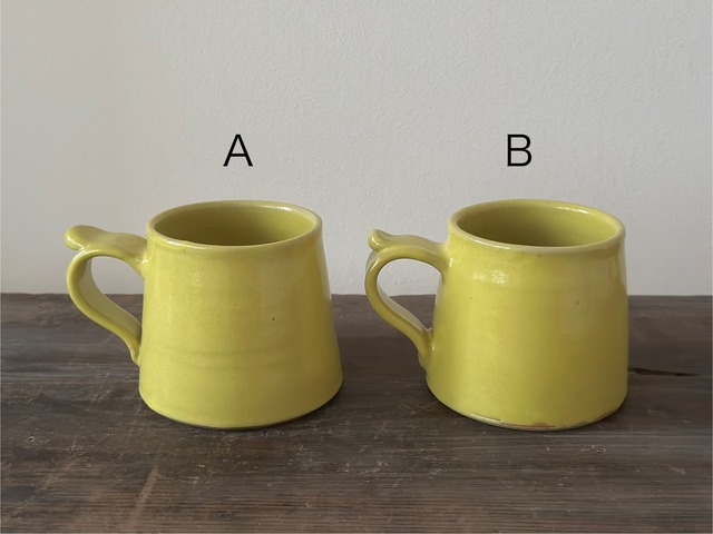 たっぷり入る円錐形のマグカップです。 鮮やかなレモンイエローが爽やかです。 A 口径7.4cm 高さ7.9cm B 口径7.3cm 高さ7.8cm 容量約300cc