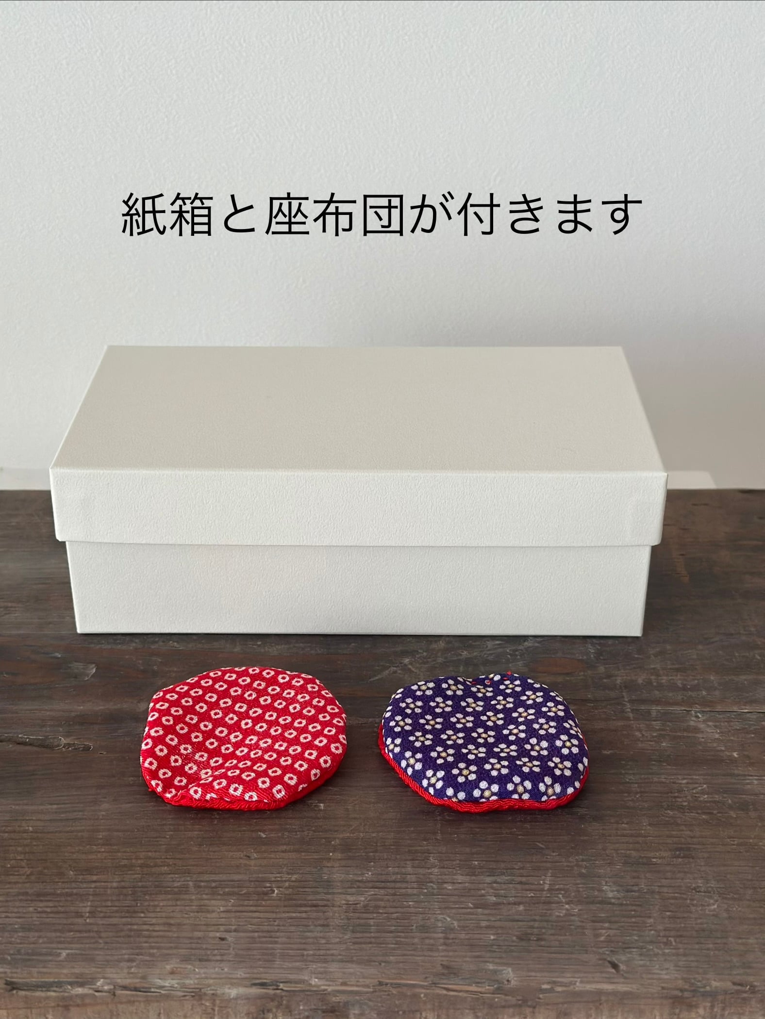紙箱と座布団が付きます。